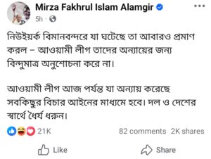 নিউইয়র্কের বিমানবন্দরের ঘটনা নিয়ে ফেসবুকে মির্জা ফখরুলের প্রতিক্রিয়া