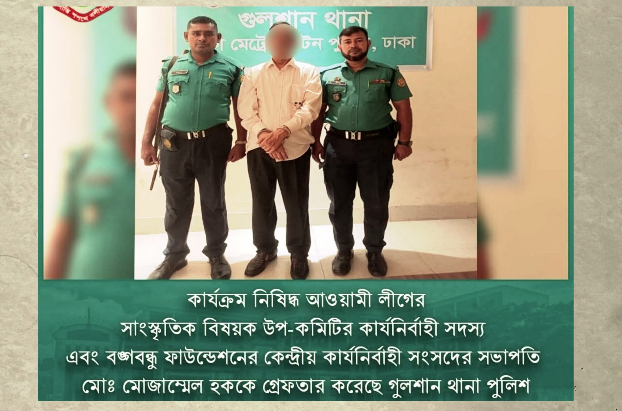 বুধবার (২৪ সেপ্টেম্বর) দুপুর আনুমানিক ১২:৩০ ঘটিকায় গুলশান-১ এলাকায় অভিযান পরিচালনা করে কার্যক্রম নিষিদ্ধ আওয়ামী লীগের সাংস্কৃতিক বিষয়ক উপ-কমিটির কার্যনির্বাহী সদস্য এবং বঙ্গবন্ধু ফাউন্ডেশন কেন্দ্রীয় কার্যনির্বাহী সংসদের সভাপতি মোঃ মোজাম্মেল হক (৬৭) কে গ্রেফতার করেছে ডিএমপির গুলশান থানা পুলিশ।
