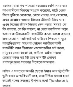এই ভাই ওই ভাইয়ের পিছনে না ঘুরে আত্মবিশ্বাসের সঙ্গে বাংলাদেশ জাতীয়তাবাদী রাজনীতি আর লিবারেল ডেমোক্রেসির চর্চা করো, মানুষের সেবা করো! না, কাউকে মাইর দেওয়া তোমার কাজ না! ইউ হ্যাভ ডান ইট এনাফ! গণঅভ্যুত্থানের সরকার নিজেকে সামলাক! তিনি আরও উল্লেখ করেন, লাইফে সবচেয়ে জরুরি হলো ইমান আর স্ট্র্যাটেজি! তুমি যখন আত্মবিশ্বাসী হবে, রাজনীতিও সোজা হবে! তাতেই দলের সবচেয়ে উপকার হবে! The choice is yours!