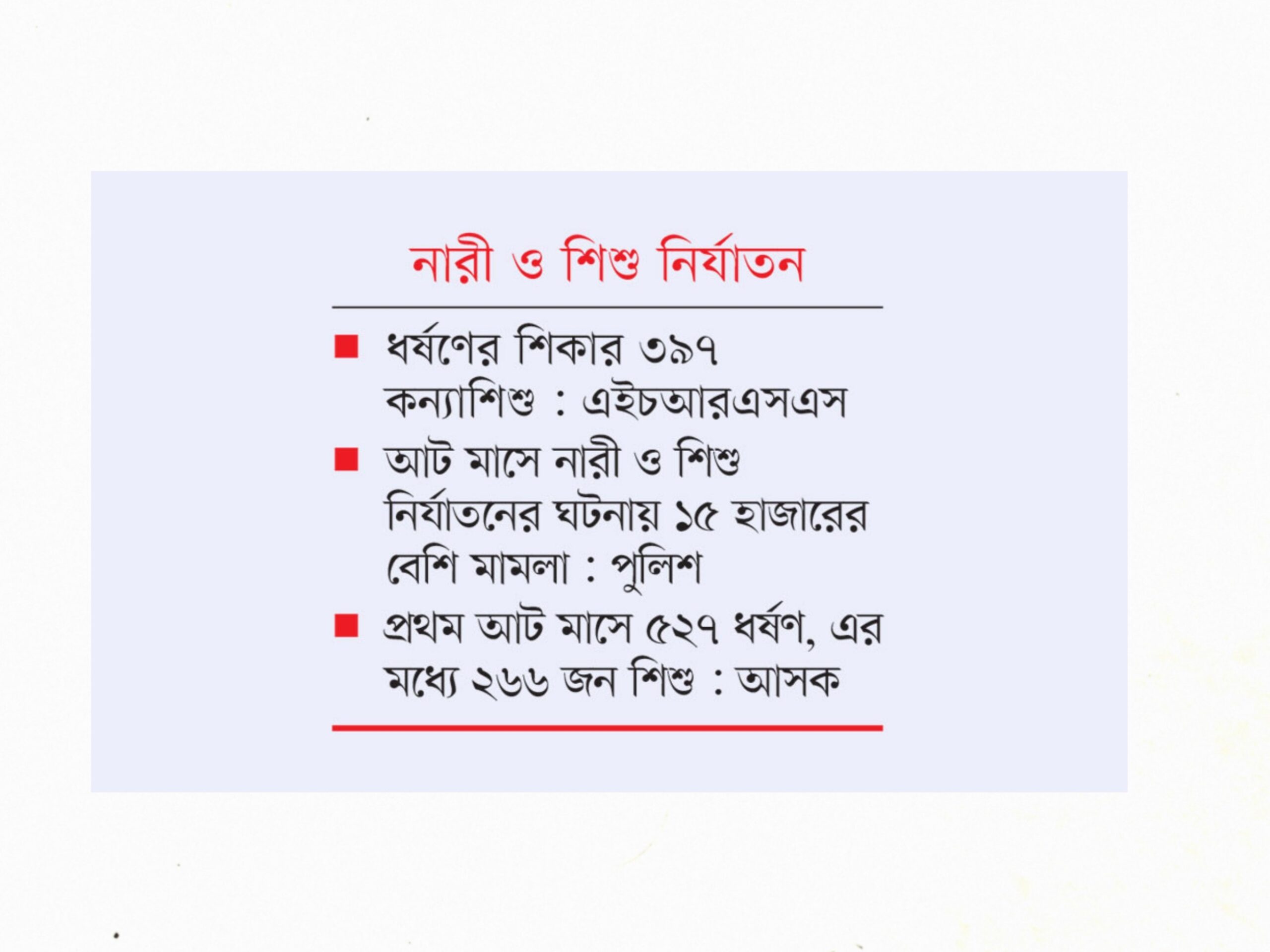 মানবাধিকার সংস্থা আইন ও সালিশ কেন্দ্রের (আসক) পরিসংখ্যান বলছে, চলতি বছরের প্রথম আট মাসে ৫২৭টি ধর্ষণের ঘটনা ঘটেছে। এর মধ্যে ২৬৬ জনই শিশু। ধর্ষণের পর ২৬ জনকে হত্যা করা হয়েছে। আত্মহত্যা করেছে ছয়জন।