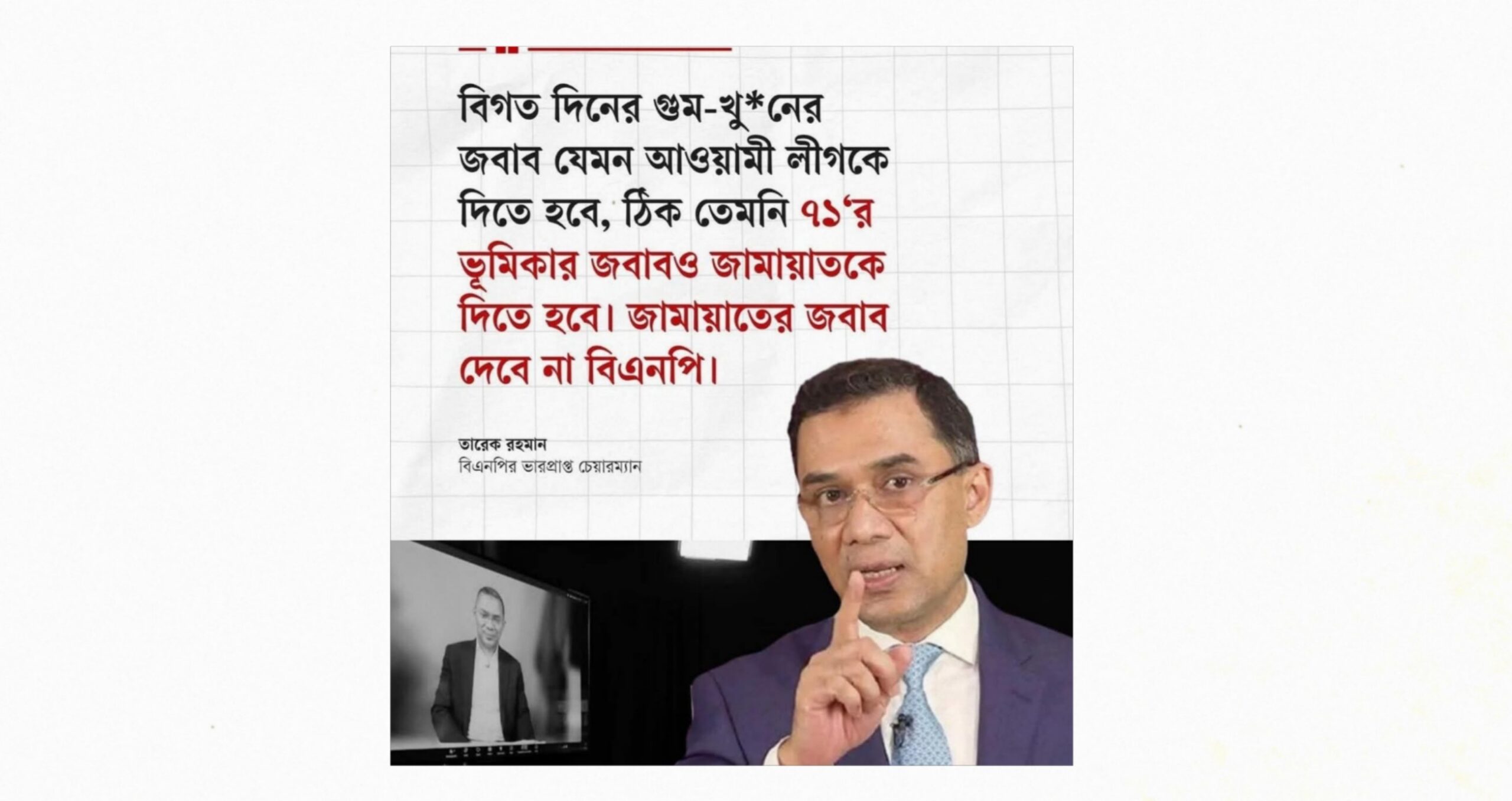 গুম খুনের জবাব আওয়ামী লীগকে আর ৭১’র ভূমিকার জবাব জামায়াতকে দিতে হবে-তারেক রহমান