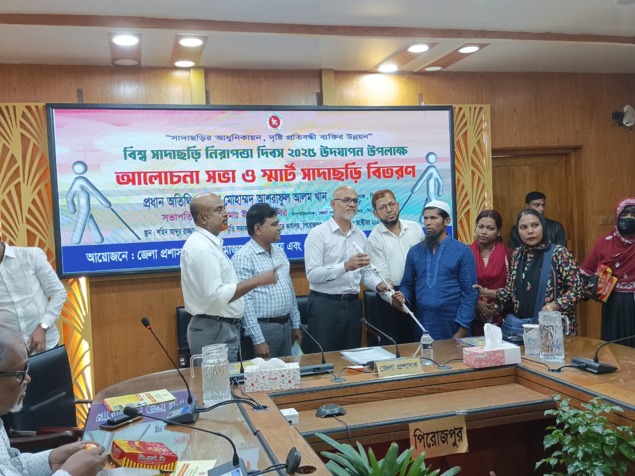 আলোচনা অনুষ্ঠান শেষে পাঁচজন দৃষ্টি প্রতিবন্ধীর মাঝে স্মার্ট সাদাছড়ি তুলে দেন পিরোজপুরের জেলা প্রশাসক।
