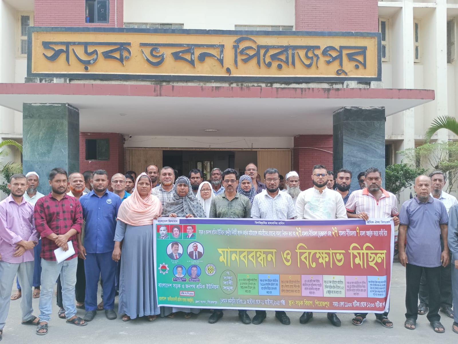 বাংলাদেশ সড়ক ও জনপথ শ্রমিক ইউনিয়ন পিরোজপুর জেলা শাখার মানববন্ধন ও বিক্ষোভ মিছিল