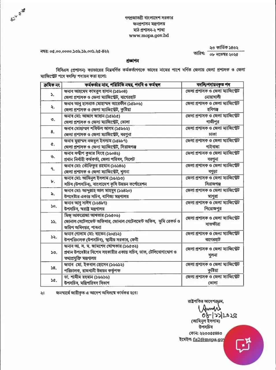 রদবদল হওয়া কর্মকর্তাদের মধ্যে—বাগেরহাটের ডিসি আহমেদ কামরুল হাসানকে নোয়াখালী, কুষ্টিয়ার ডিসি আবু হাসনাত মোহাম্মদ আরেফীনকে হবিগঞ্জ, ভোলার ডিসি মো. আজাদ জাহানকে গাজীপুর, বরগুনার ডিসি মোহাম্মদ শফিউল আলমকে ঢাকা, সিরাজগঞ্জের ডিসি মুহাম্মদ নজরুল ইসলামকে গাইবান্ধা, সিলেট জেলা পরিষদের প্রধান নির্বাহী কর্মকর্তা সন্দ্বীপ কুমার সিংহকে বরগুনা ও খুলনার ডিসি মো. তৌফিকুর রহমানকে বগুড়ার দায়িত্ব দেওয়া হয়েছে।