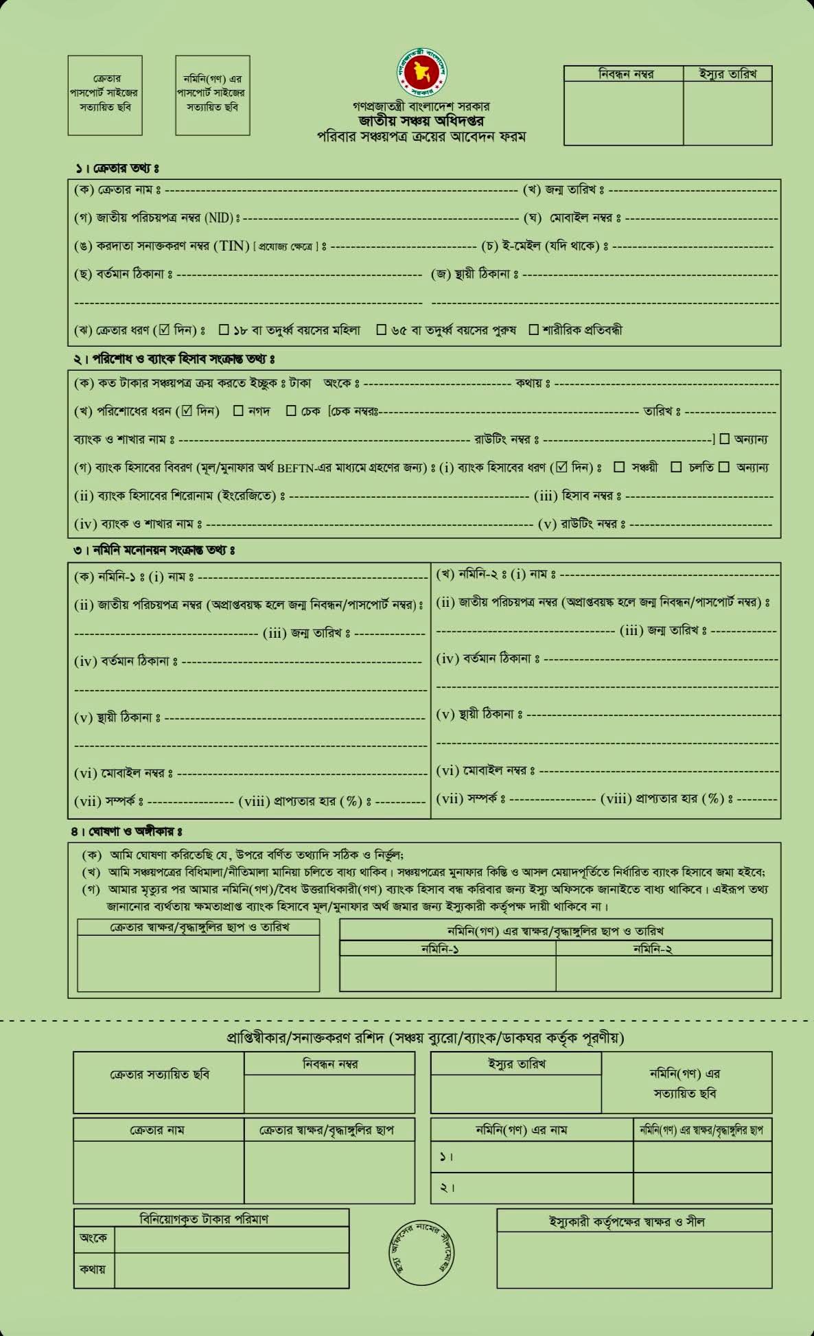 -দুই পৃষ্ঠার এই ফর্ম এপিঠ-ওপিঠ প্রিন্ট করে আবেদনের মাধ্যমে পরিবার সঞ্চয়পত্র ক্রয় করা যাবে।