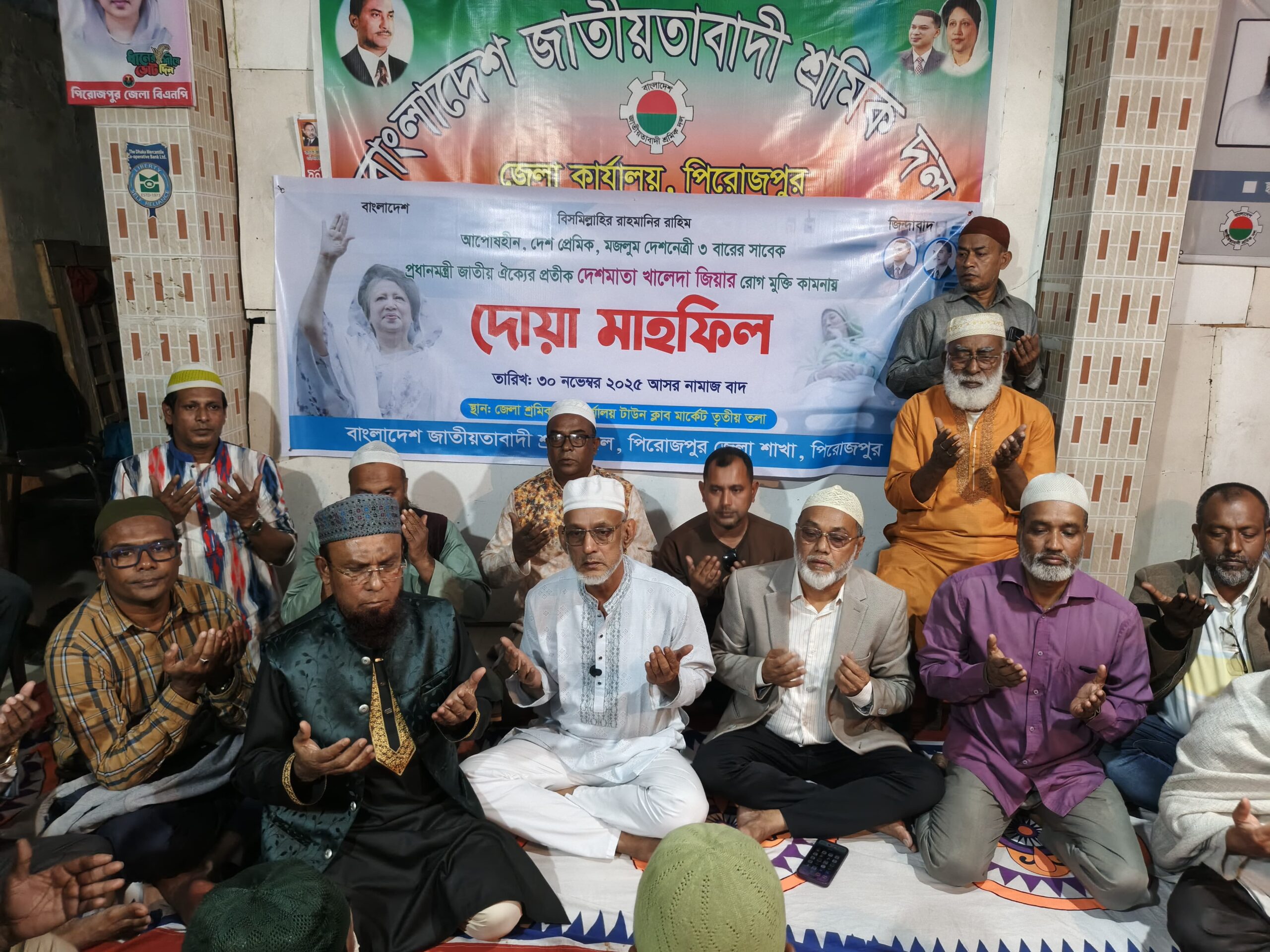 পিরোজপুরে বিএনপি চেয়ারপারসন ও সাবেক প্রধানমন্ত্রী খালেদা জিয়ার রোগমুক্তি কামনায় দোয়া মাহফিল অনুষ্ঠিত হয়েছে। শনিবার (৩০ নভেম্বর) বিকেলে বাংলাদেশ জাতীয়তাবাদী শ্রমিক দল পিরোজপুর জেলা শাখার উদ্যোগে শ্রমিক দলের কার্যালয়ে এ দোয়া মাহফিল আয়োজন করা হয়।