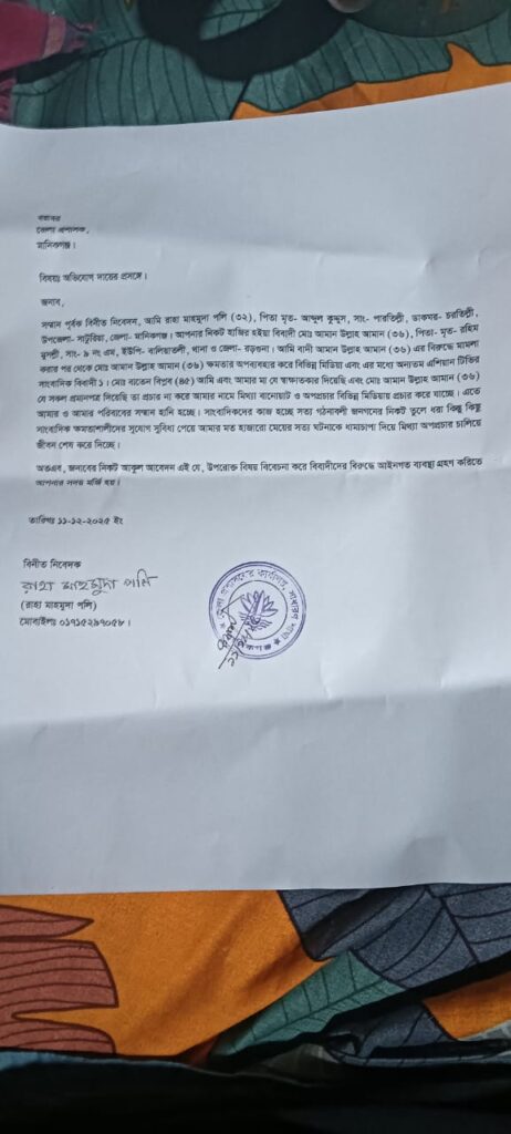মানিকগঞ্জের সাটুরিয়া উপজেলার বিএনপি নেত্রী রাহা মাহমুদা পলি এশিয়ান টিভির সাংবাদিক আব্দুল বাতেন-এর বিরুদ্ধে প্রতারণা, মিথ্যা তথ্য প্রচার ও ব্যক্তিগত মানহানির গুরুতর অভিযোগ তুলেছেন।