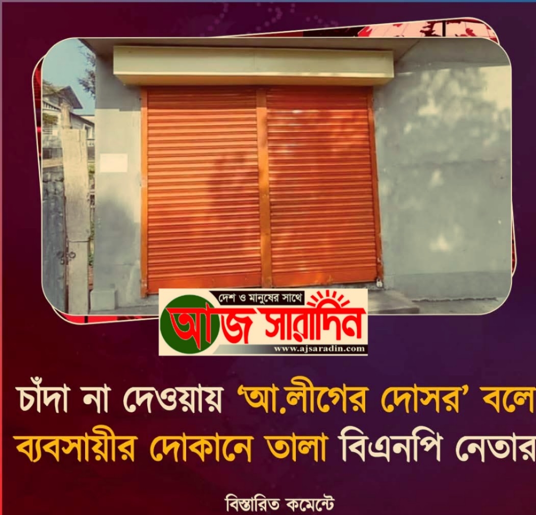 পটুয়াখালীতে ৫০ হাজার টাকা চাঁদা না দেওয়ায় আওয়ামী লীগের দোসর আখ্যা দিয়ে এক ব্যবসায়ীর দোকানে তালা দিয়েছেন পৌর বিএনপির উপদেষ্টা কমিটির নেতা শাহিন গাজী ও তার সহযোগীরা। এ বিষয়ে স্থানীয় বিএনপির কয়েকজন নেতার কাছে মৌখিকভাবে অভিযোগ দিয়েছেন ভুক্তভোগী ব্যবসায়ী।